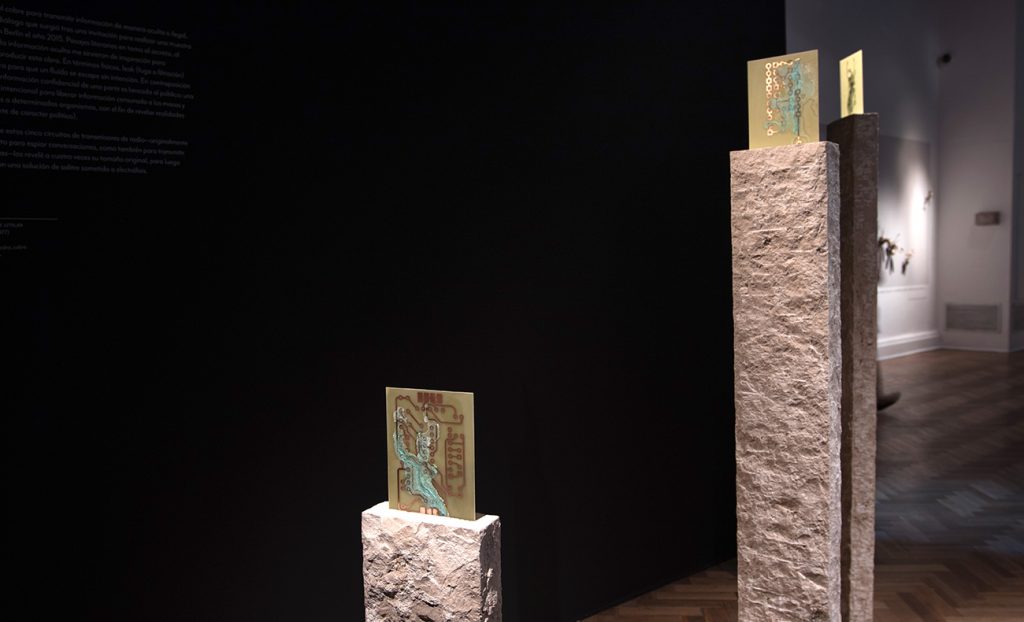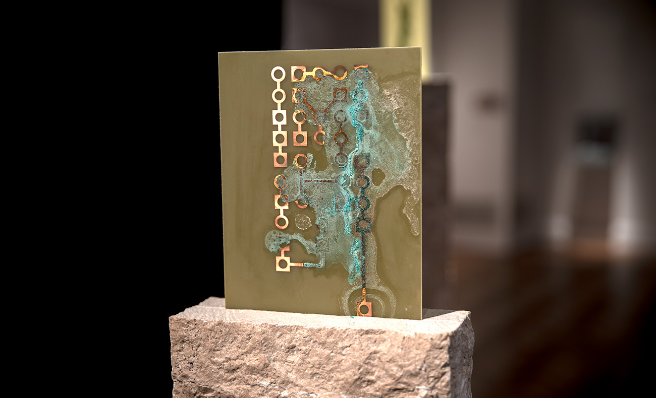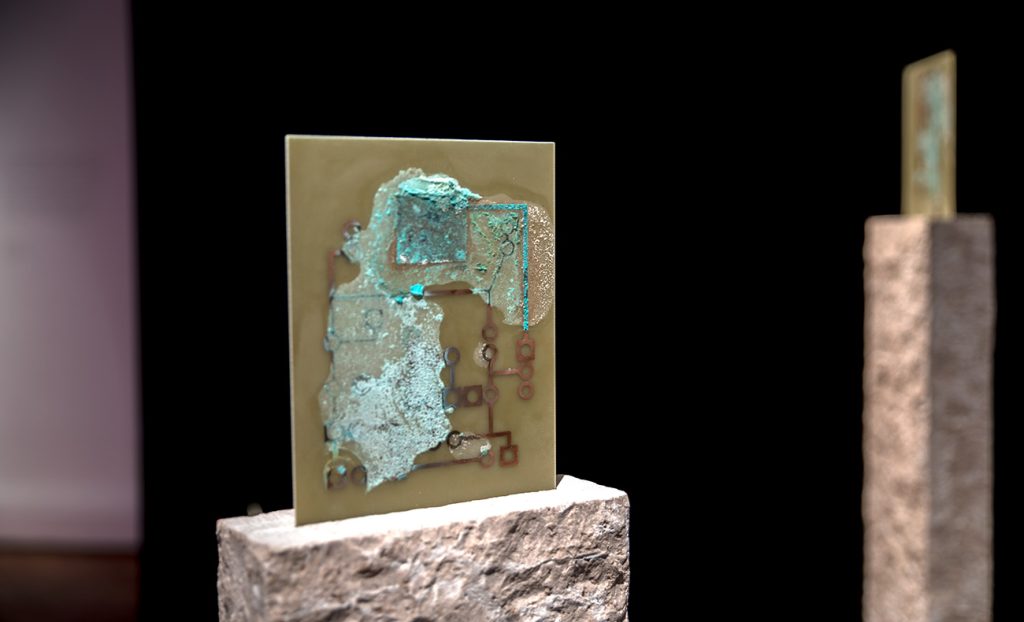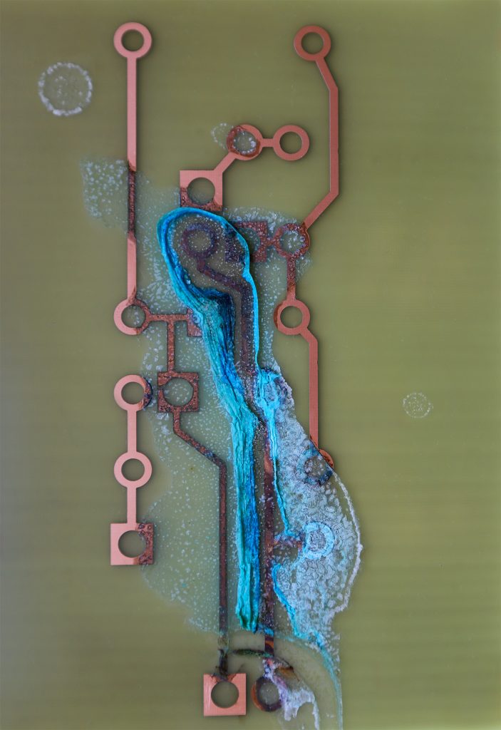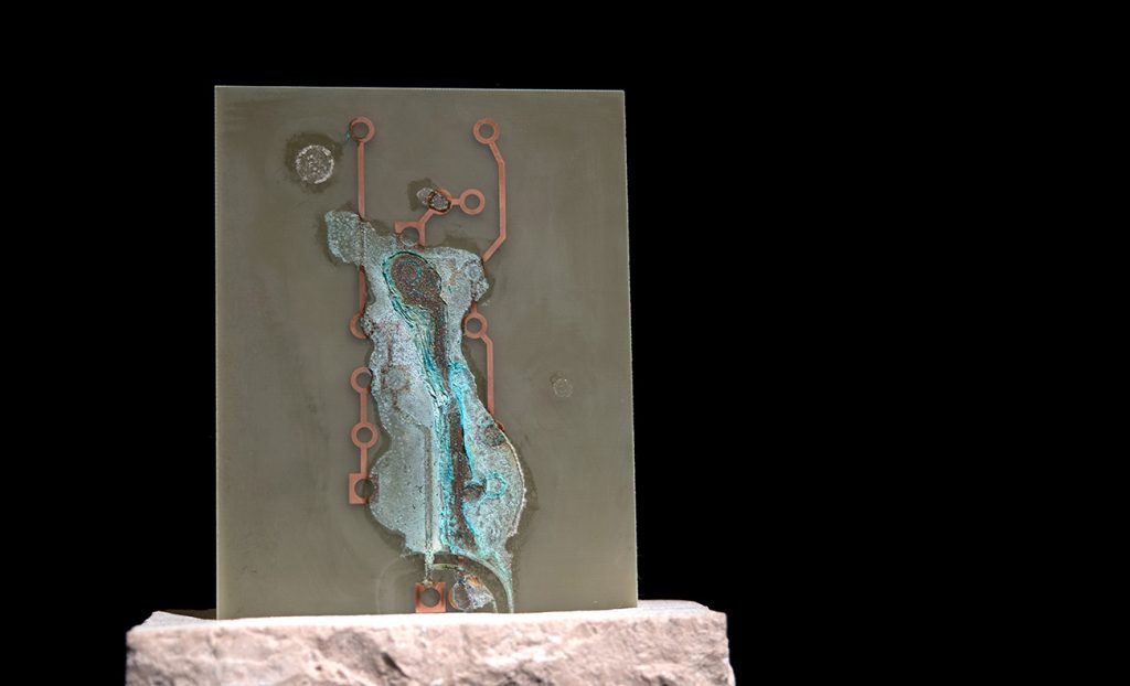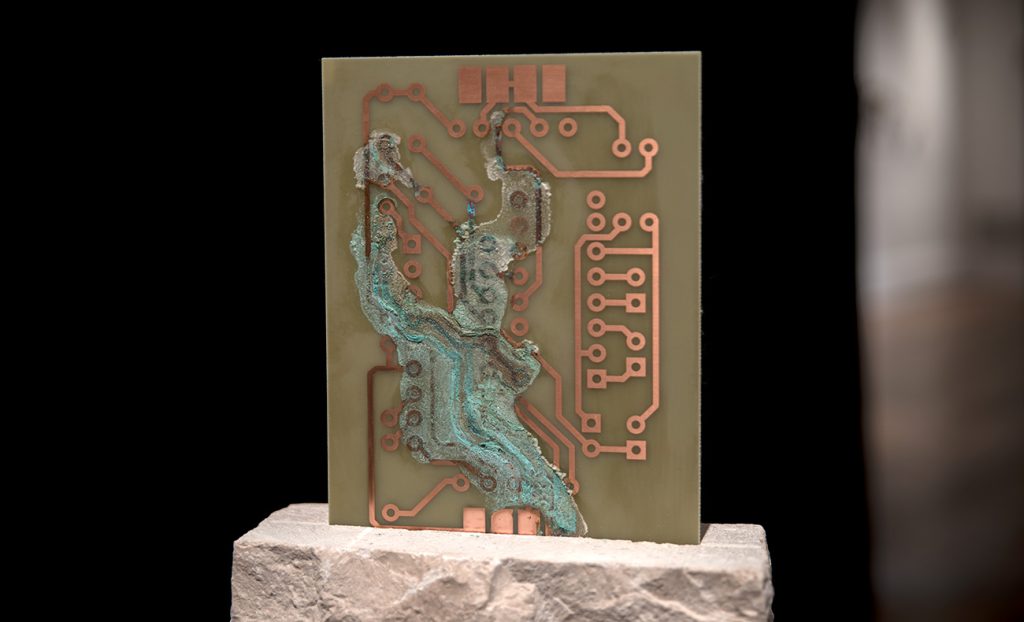 Scaled at four times their original size, each one of these five FM radio transmitter circuits—originally created to both spying conversations and transmitting pirate radios—are leaked using electrolysis with diluted saltpetre. The result is a narrative disclosure of source code made and damaged by a chemical orchestration of mineral resources.