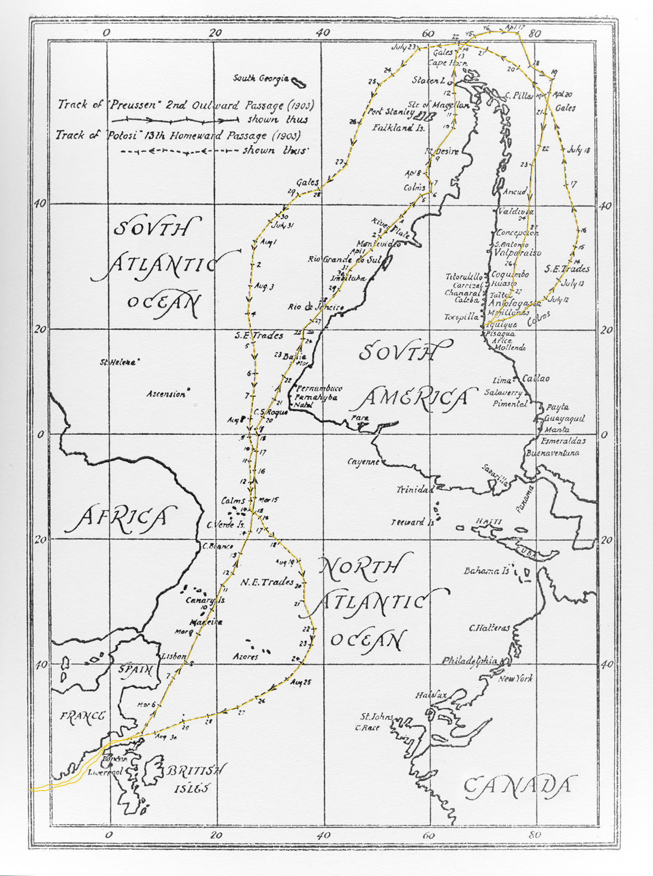 Text and subjective map of the saltpetre maritime route, based on a navigation chart from the book The Nitrate Clippers, from Basil Lubbok, 1932.