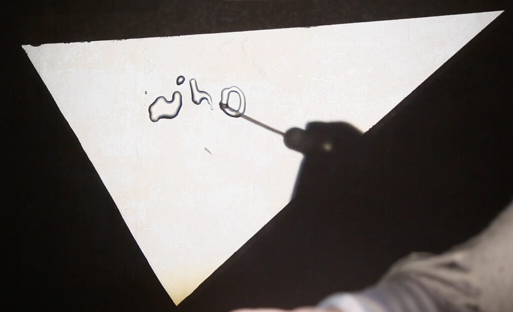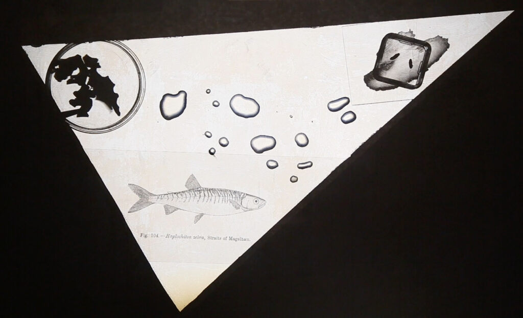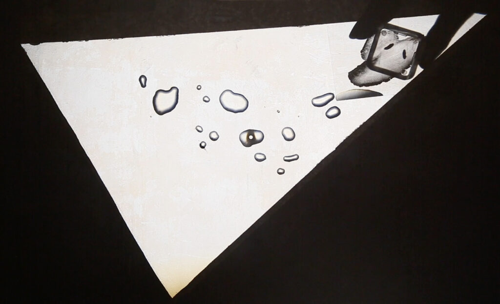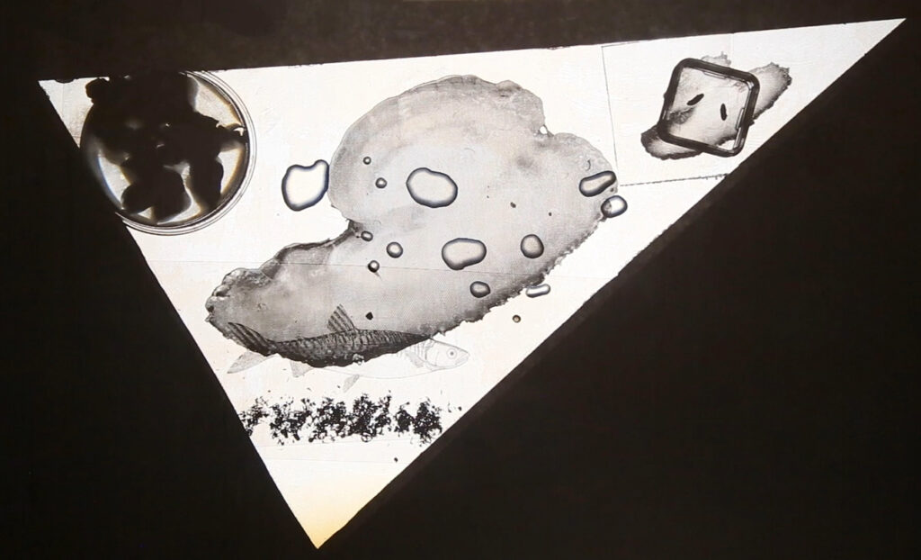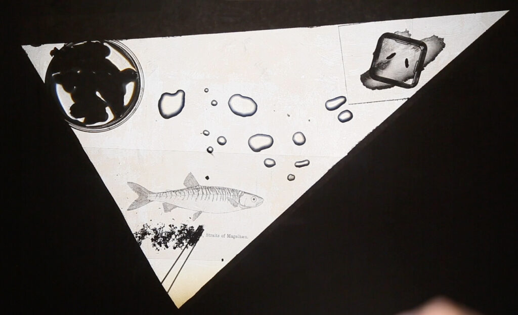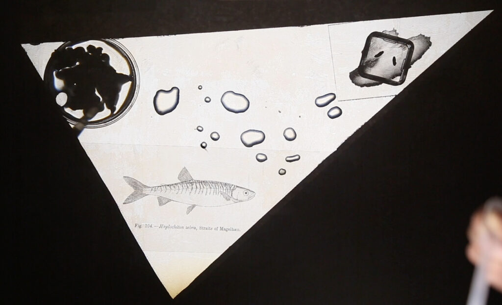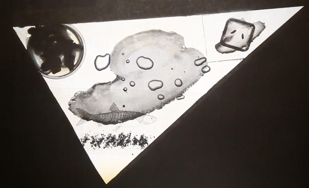overhead projector, saltpetre (sodium nitrate), water, prints on transparent mica, documentation,