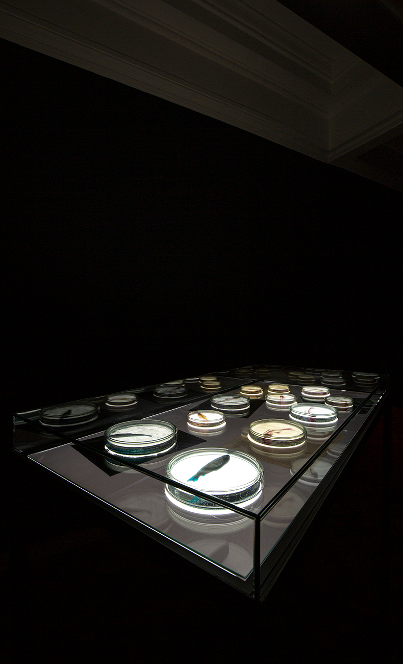 Metal, LED panel, acrylic, translucent film, transparent papers, carbon papers, petri dishes, Salmo Salar corpses, glycerine