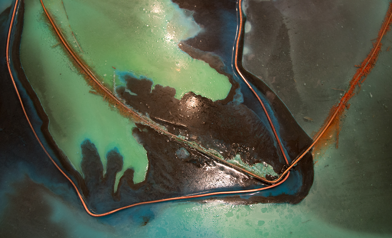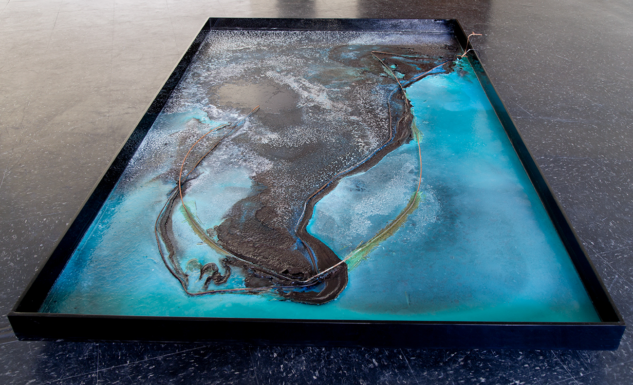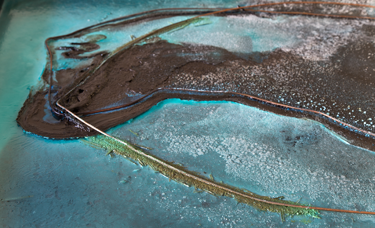 Offshoring Pathways is an installation that contains saltpetre diluted in water, with positively and negatively electrified copper wires depticting the maritime routes between Europe and what is today Chile. As the electrolysis process begins and the water starts evaporating, an aerial image slowly appears in the pool during the exhibition time. Copper electrons are absorbed and released, colouring the ocean representation with blue-green, while the continent area is transparent due to the reduction process, thus taking the colour from the background pool. Slow changes due to water evaporation and oxidizing copper morph the crystal drawing according to the different configurations of its elements.