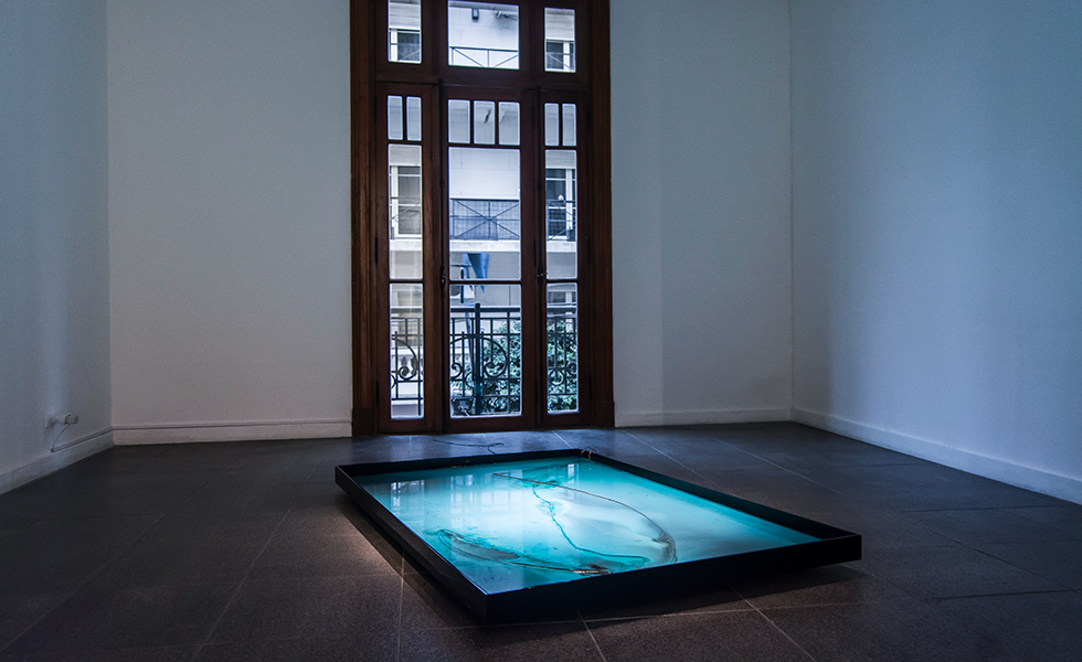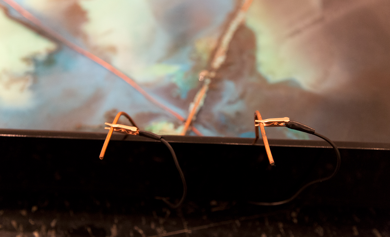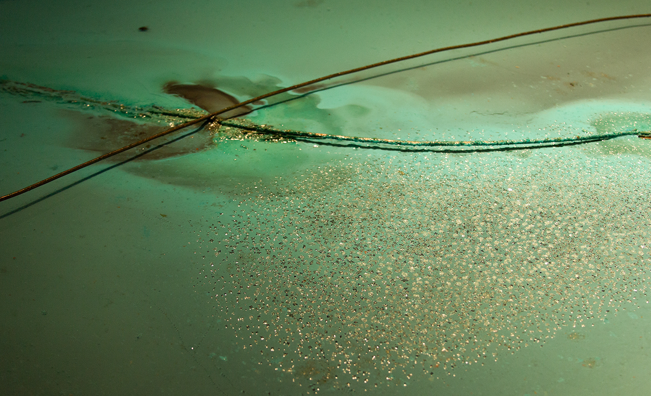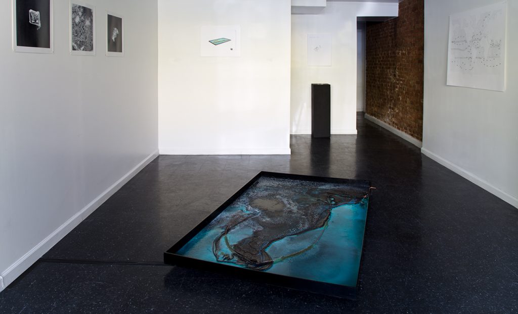 Offshoring Pathways is an installation that contains saltpetre diluted in water, with positively and negatively electrified copper wires depticting the maritime routes between Europe and what is today Chile. As the electrolysis process begins and the water starts evaporating, an aerial image slowly appears in the pool during the exhibition time. Copper electrons are absorbed and released, colouring the ocean representation with blue-green, while the continent area is transparent due to the reduction process, thus taking the colour from the background pool. Slow changes due to water evaporation and oxidizing copper morph the crystal drawing according to the different configurations of its elements.