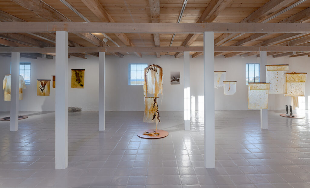 These and other matters are addressed in the interactive theatrical performance Salm Ethos, which is based on a true story concerning a Norwegian researcher, illustrating the interconnectedness of humans and the environment. For this, Letelier proposed an exploration of bioplastics, integrating algae and other ‘resources’ for the production of the costumes and installation.