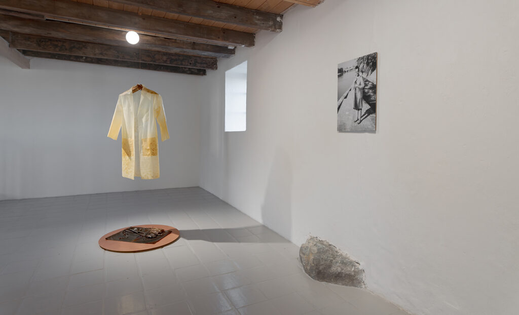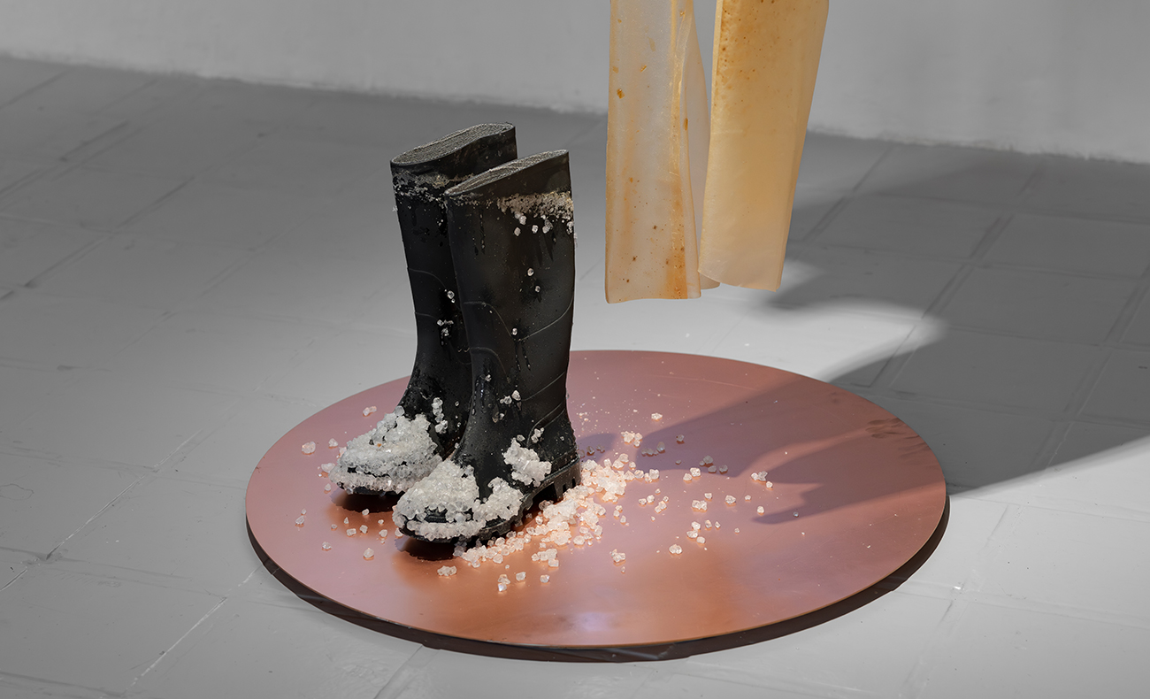 Bioplastic costumes, copper, metal, algae, wood dye, Salmo-salar bones, photographs, rubber boots, crystals, sound